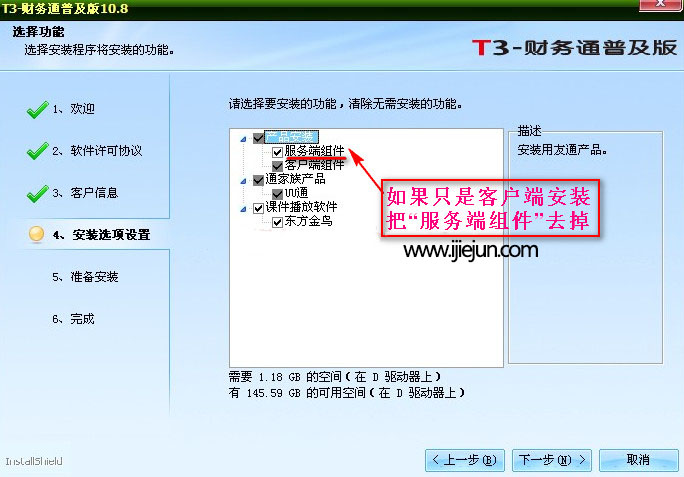 如果只是客戶端安裝要把“服務端組件”去掉,另外如果是T3用友通客戶端安裝,不需要安裝數(shù)據(jù)庫。