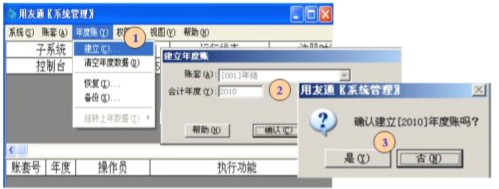 操作:以賬套主管的身份登錄系統(tǒng)管理,建立年度賬