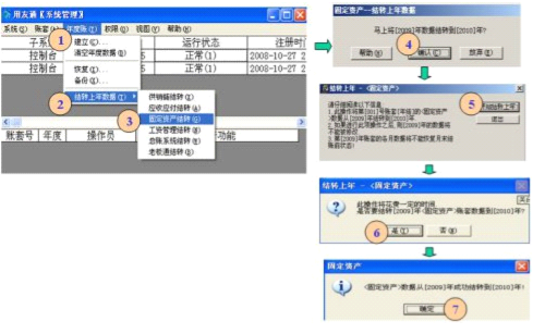 操作:年度賬->結(jié)轉(zhuǎn)上年數(shù)據(jù)->固定資產(chǎn)結(jié)轉(zhuǎn)->確認(rèn)->開始結(jié)轉(zhuǎn)上年->->結(jié)束