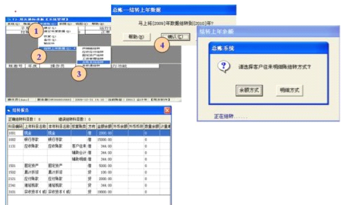 操作:年度賬->結(jié)轉(zhuǎn)上年數(shù)據(jù)->總賬系統(tǒng)結(jié)轉(zhuǎn)->選擇結(jié)轉(zhuǎn)方式->查看結(jié)轉(zhuǎn)報(bào)告