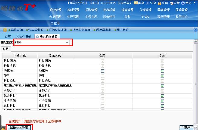 4、自定義檔案建好之后,進入“系統(tǒng)管理”-“基礎檔案設置”-“基礎檔案設置”,基礎檔案選擇“科目”,左下角點擊“輔助核算設置”。