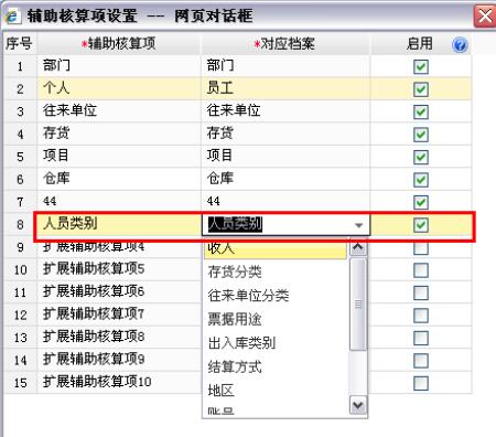 5、勾選未使用“擴展輔助核算項*”的“啟用”,將“輔助核算項”的名稱改為“人員類別”,“對應檔案”選擇第1步建立的“人員類別”檔案。