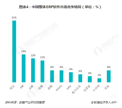 2018年前六大ERP廠商依次為用友網(wǎng)絡(luò)、SAP、金蝶國際、浪潮國際、鼎捷和Oracle,國內(nèi)ERP廠商各家市場份額均有明顯提升,分別為用友網(wǎng)絡(luò)31%、金蝶國際12%、浪潮國際11%和鼎捷6%,四家合計達(dá)60%。